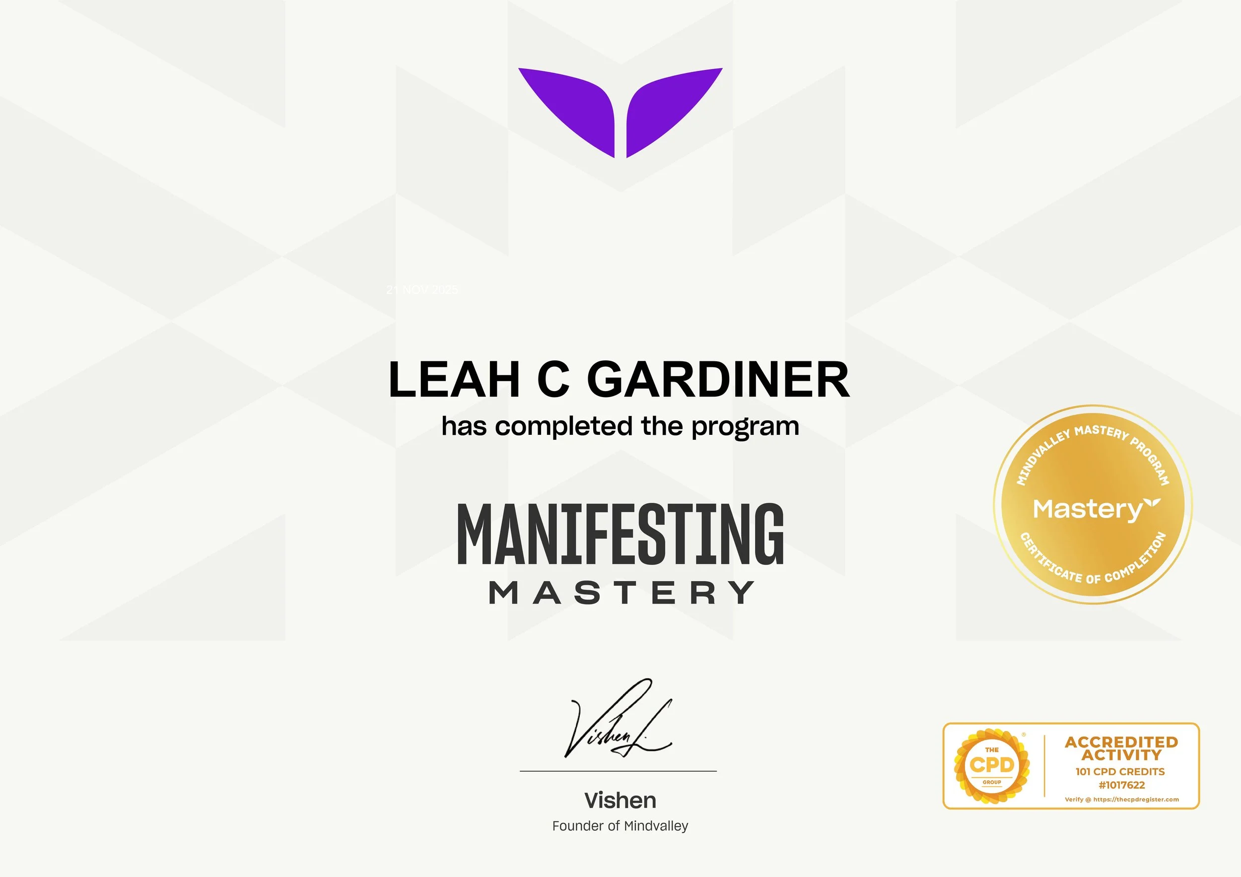 Graduate of Mindvalley’s Manifesting Mastery, deepening expertise in manifestation psychology, belief restructuring, and alignment-based strategy to better support clients in creating intentional, results-driven change.
